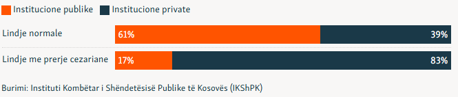 Por, sipas të dhënave të Institutit Kombëtar të Shëndetësisë Publike të Kosovës, ky trend nuk është i njëjtë në të gjitha institucionet: në vitin 2024, spitalet private dominuan për nga numri i lindjeve me prerje cezariane.