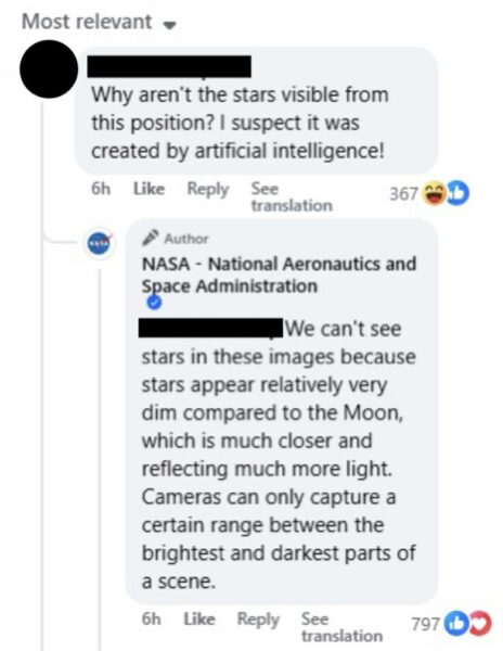 Në postimin ku paraqiteshin pamje të realizuara nga anija kozmike Orion gjatë fluturimit rreth anës së fshehtë të Hënës, qytetari nga Kosova pyeti pse nuk duken yjet në fotografi dhe sugjeroi se pamjet mund të ishin krijuar nga inteligjenca artificiale.