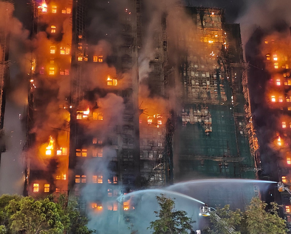 Disa punonjës të shërbimeve zjarrfikëse u plagosën ndërsa përpiqeshin të shuanin flakët që përshkuan kullat 31-katëshe. Njerëzit u mblodhën në një shteg aty pranë, ndërsa tymi dilte nga ndërtesat, disa prej të cilave ishin të veshura me skela bambuje.