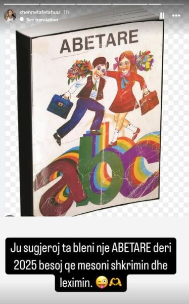 Pas këtyre postimeve, reagoi Xheneta, e cila postoi foton e ‘Abetares’ në Instagram ku shkruan: “Ju sugjeroj ta blini një Abetare deri 2025 besoj që mësoni shkrimin dhe leximin”.