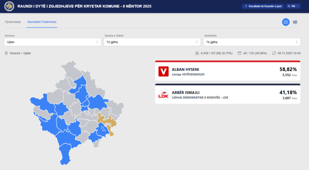 Kandidati i LVV-së për kryetar të Gjilanit, Alban Hyseni ka marrë 58,82% apo 5,552 vota, kur janë numëruar 30,08% e tyre.
