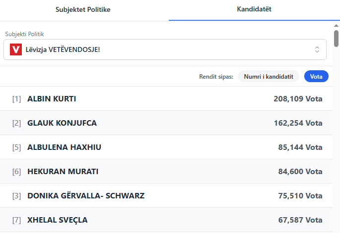 Deri më tani me mbi 60% të votave të numëruara, Albin Kurti ka marrë 208,109 vota.