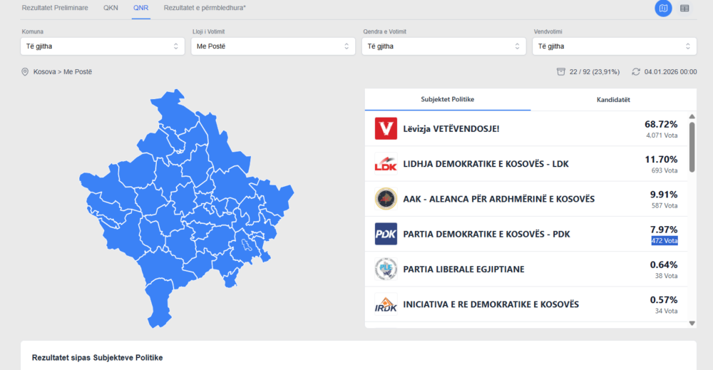 Lëvizja Vetëvendosje, vazhdon të prijë me 68.72%, ose 4,071 Vota