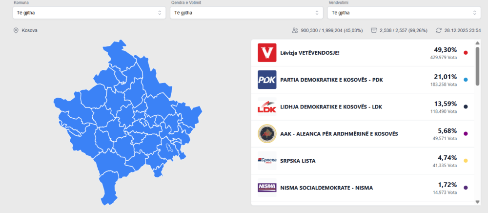 KQZ, në faqen e saj njofton se nga votat e numëruara deri më tani, Lëvizja Vetëvendosje prin e para me 49,30%, ose, 429,979 të votave.