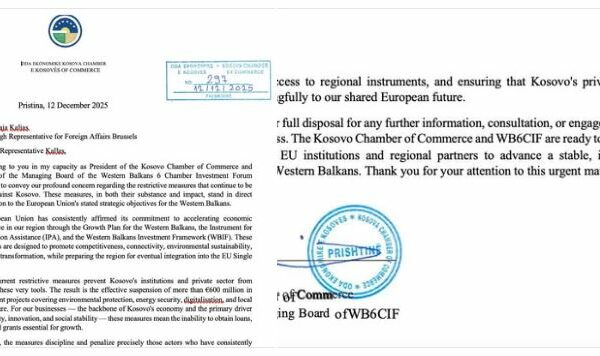 “Oda Ekonomike e Kosovës kërkon heqjen e këtyre masave për të mundësuar qasje të barabartë në instrumentet rajonale dhe për të garantuar që sektori privat i Kosovës të kontribuojë në të ardhmen evropiane të përbashkët”, thuhet në njoftimin e Odës.