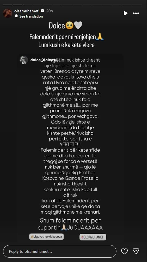 Në fund të postimit, Dolce shtoi: “Faleminderit për këtë përvojë unike që do ta mbaj gjithmonë me krenari. Shumë faleminderit për suportin, ju dua”, duke bërë tag në Big Brother dhe Olsa Muhametin