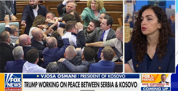 Presidentja Vjosa Osmani ka dhënë një intervistë në mediumin e njohur amerikan “Fox News” gjatë qëndrimit të saj në SHBA, e cila mblodhi liderë nga e gjithë bota për Asamblenë e Përgjithshme të OKB-së. Derisa tema e bisedës mes Osmanit dhe nikoqirit të Fox News s’kishte të bënte me politikën e brendshme të Kosovës, por … Continue reading Osmani shkon për intervistë, Fox News nxjerr pamje të rrahjes mes VV’së dhe opozitës para dy vitesh
