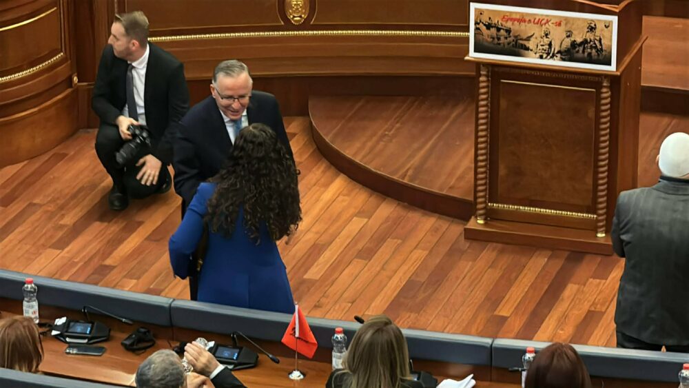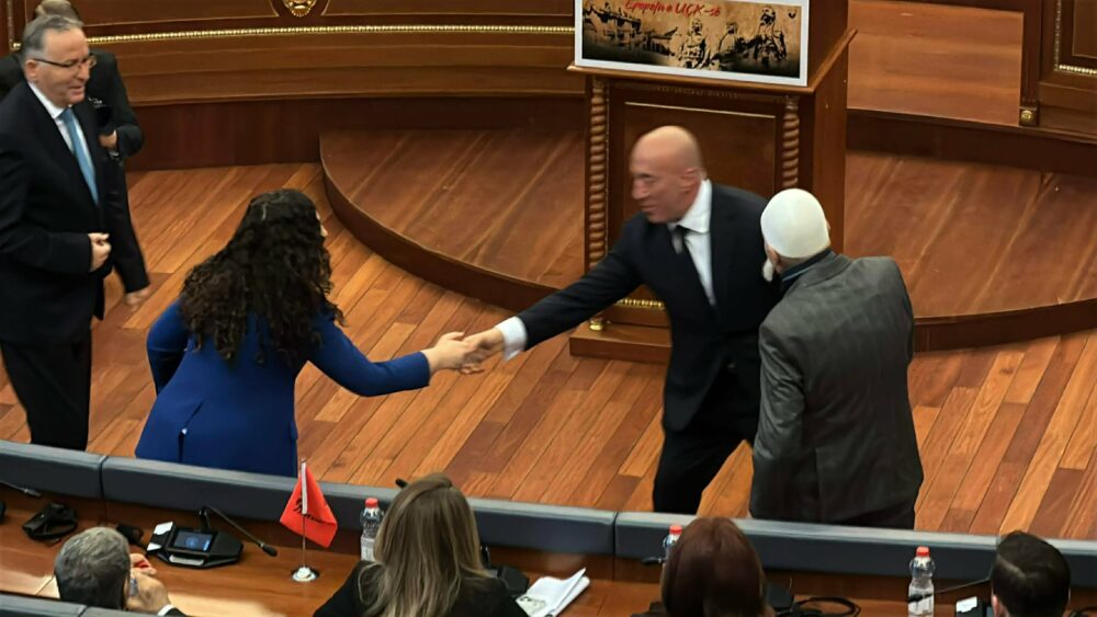 Liderët opozitarë, Bedri Hamza i PDK-së e Ramush Haradinaj i AAK-së, u përshëndetën me presidenten Vjosa Osmani në seancën e sotme solemne për shënimin e Epopesë së UÇK-së.