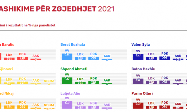 Analisti Bleron Baraliu ka parashikuar se VV’ja do të marrë 45 përqind, LDK’ja 14 përqind, PDK’ja 19 përqind dhe AAK’ja 7 përqind.