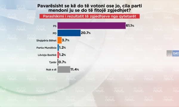 Kësaj pyetje qendrore politike për zgjedhjet, 61.1% e qytetarëve parashikojnë se zgjedhjet do të fitohen nga PS. Ndërkohë 20.7% e të pyeturve parashikojnë se zgjedhjet do t’i fitojë PD, 3.7% parashikojnë se do t’i fitojë Shqipëria Bëhet, 1.2% mendojnë se do t’i fitojë Partia Mundësia dhe 1.2 % parashikojnë si fituese Lëvizja Bashkë.