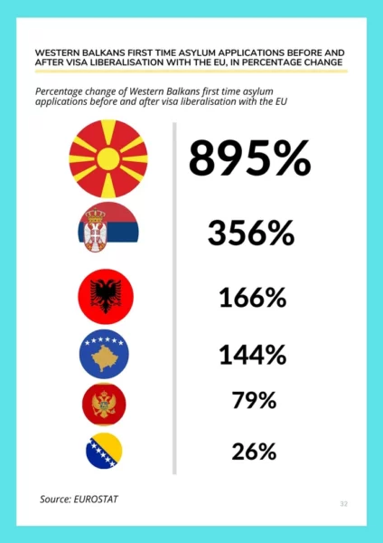 Instituti thekson se, ndonëse përqindja e rritjes prej 144% mund të duket e lartë, ajo mbetet dukshëm më e ulët krahasuar me vendet e tjera të rajonit në vitin e parë të liberalizimit të vizave. Në rastin e Maqedonisë së Veriut, rritja e numrit të azilkërkuesve kishte arritur në 895%, në Serbi 356% dhe në Shqipëri 166%. Vetëm Mali i Zi dhe Bosnja dhe Hercegovina kishin arritur ta mbanin rritjen nën nivelin 100%.