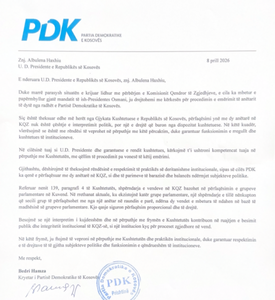 Në kërkesë theksohet se çështja e përbërjes së KQZ-së ka mbetur e papërfunduar gjatë mandatit të ish-Presidentes Vjosa Osmani dhe se përfaqësimi i PDK-së me dy anëtarë në këtë institucion nuk është çështje interpretimi politik, por një e drejtë që rrjedh nga dispozitat kushtetuese.
