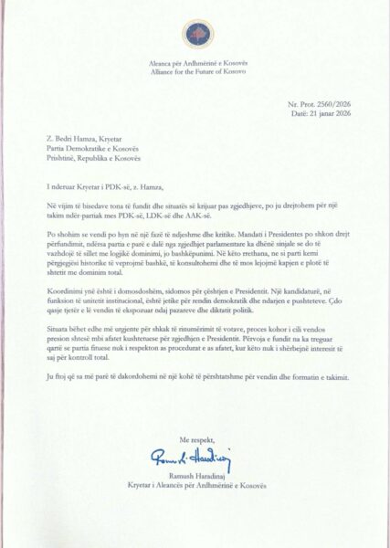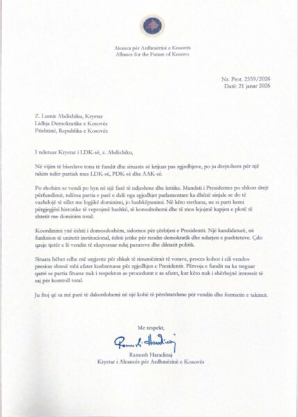 Ramush Haradinaj, për herë të parë në Pressing në T7 ka bërë publike letrat drejtuar Abdixhikut dhe Hamzës, me datë 21 janar të këtij viti, duke kërkuar koordinim për situatën politike sidomos për çështjen e presidentit.