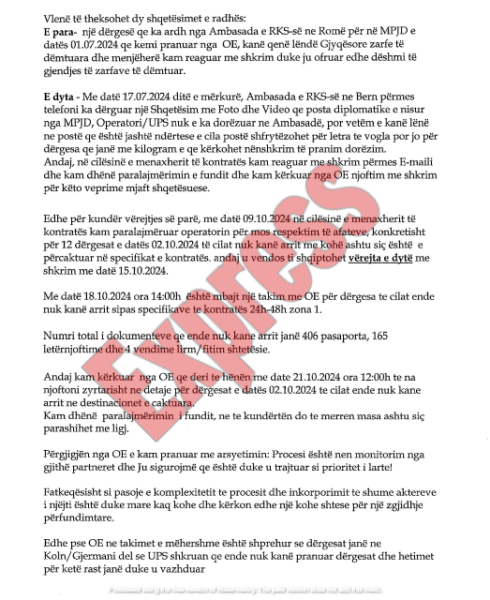 “Më 1 korrik MPJD kishte adresuar ankesë tek operatori pasi ishin hasur në zarfe të dëmtuara në një dërgesë me disa dokumente të gjykatave që kishin arritur në Ambasadën e Kosovës në Romë. Më 17 korrik, Ambasada e Kosovës në Bernë gjithashtu kishte shprehur shqetësim përmes telefonit, duke argumentuar me fotografi dhe video se si dërgesa diplomatike ishte lënë jashtë në postën e destinuar për letra më të vogla”