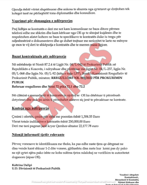 Vendimi është nënshkruar nga Kaltrina Dalipi, Ushtruese e Detyrës së Divizionit Prokurimit Publik, e cila ka lidhje familjare me Luan Dalipin, shefin e stafit në kabinetin e Kryeministrit Kurti.