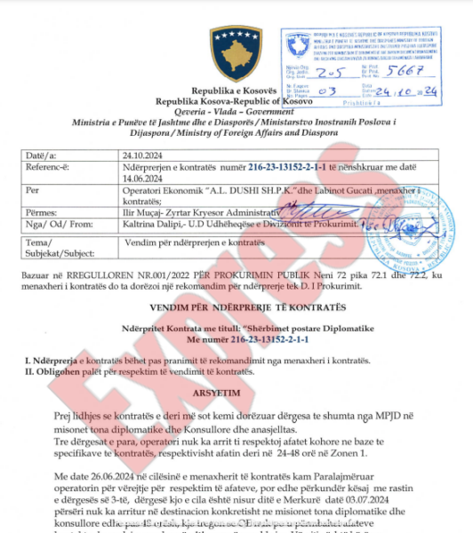 “Me datë 26.06.2024 në cilësinë e menaxherit të kontratës kam paralajmëruar operatorin për vërejtje për respektim të afateve, por edhe përkundër kësaj me rastin e dërgesës së 3-të, dërgesë kjo e cila është nisur ditën e mërkurë datë 03.07.2024 përsëri nuk ka arritur në destinacion konkretisht në misionet tona diplomatike dhe konsullore edhe pas 48 orësh, kjo tregon se OE nuk po u përmbahet afateve kontraktuale, andaj u vendos vërejtja e parë me shkrim. Vërejtja është bërë me shkrim dhe e protokolluar ku e njëjta i është dërguar edhe Operatorit me datën 05.07.2024” thuhet në vendim.