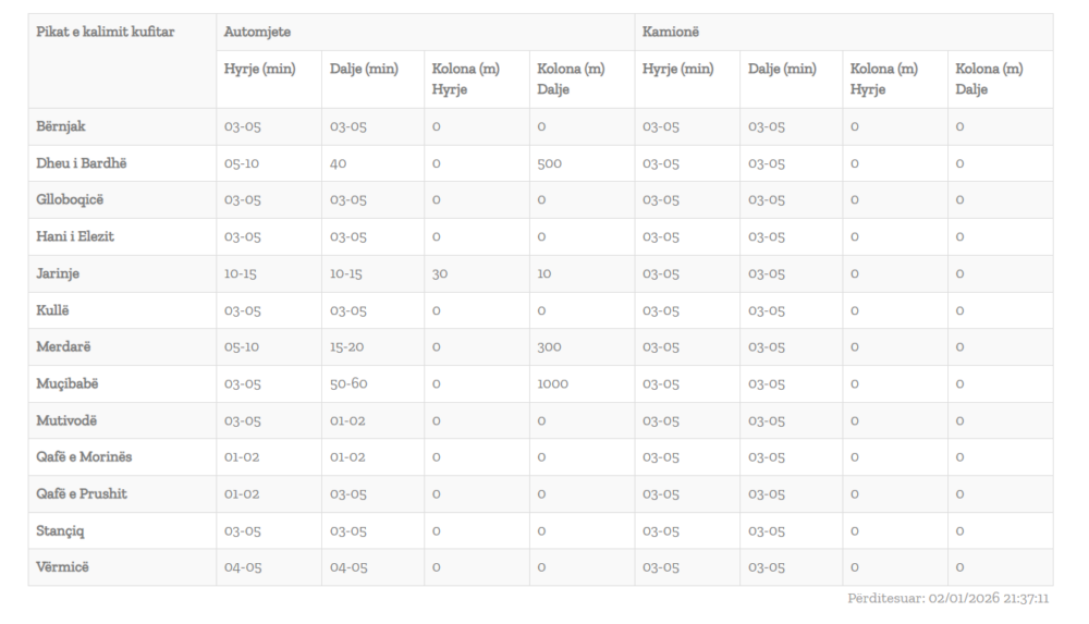 Në përditësimin e fundit të te dhënave, bëhet e ditur se pritjet në pikat kufitare, për dalje, arrijnë deri në 1 orë.