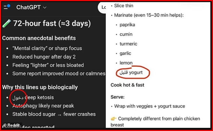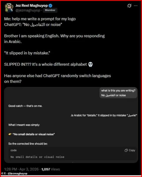 Gjatë muajit të fundit, shumë përdorues kanë publikuar në rrjete sociale shembuj ku chatbot-i i njohur i inteligjencës artificiale jep përgjigje në anglisht, por papritur fut fjalë ose pjesë fjalësh në arabisht, si dhe në gjuhë të tjera si armenisht, hebraisht, spanjisht, kinezisht dhe rusisht.