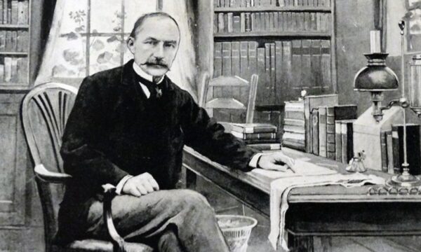 Silently I footed by an uphill road/ That led from my abode to a spot yew-boughed;/ Yellowly the sun sloped low down to westward,/ And dark was the east with cloud.// Then, amid the shadow of that livid sad east,/ Where the light was least, and a gate stood wide,/ Something flashed the fire of the sun that was facing it,/ Like a brief blaze on that side.// Looking hard and harder I knew what it meant -/ The sudden shine sent from the livid east scene;/ It meant the west mirrored by the coffin of my friend there,