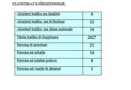 Gjatë kësaj kohe, janë raportuar të kenë ndodhur edhe 22 aksidente me të lënduar, dhe 34 me dëme materiale.