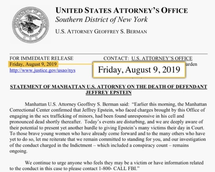 Data e përmendur si “provë” në dokumentin e brendshëm të Departamentit të Drejtësisë – 9 gusht 2019, një ditë para se Epstein të gjendej i vdekur – nuk është një dokument zyrtar dhe nuk provon asgjë.