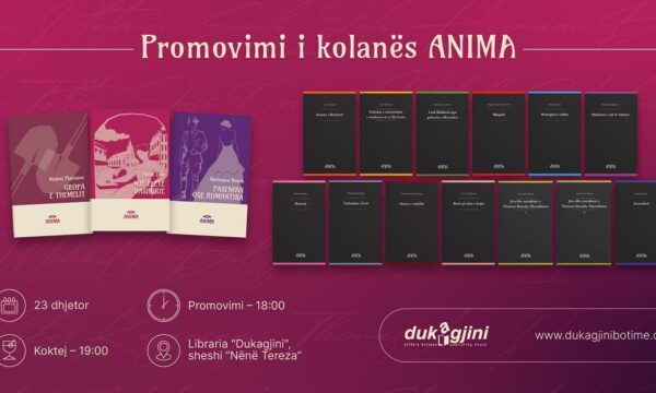 Më 23 dhjetor, në hapësirat e Librarisë “Dukagjini”, në sheshin “Nënë Tereza, do të promovohet kolana letrare ANIMA. Për të diskutuar rreth vlerës së veprave të botuara dhe kolanës ANIMA në përgjithësi, në panel do të jenë: Agron Tufa, Agron Gashi, Meliza Krasniqi dhe Adelinë Selmani.