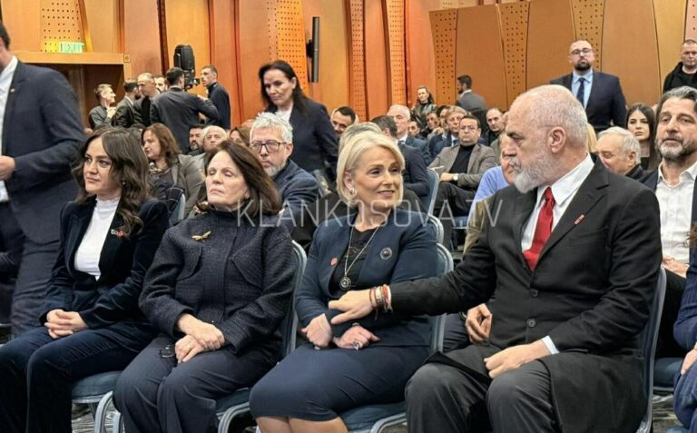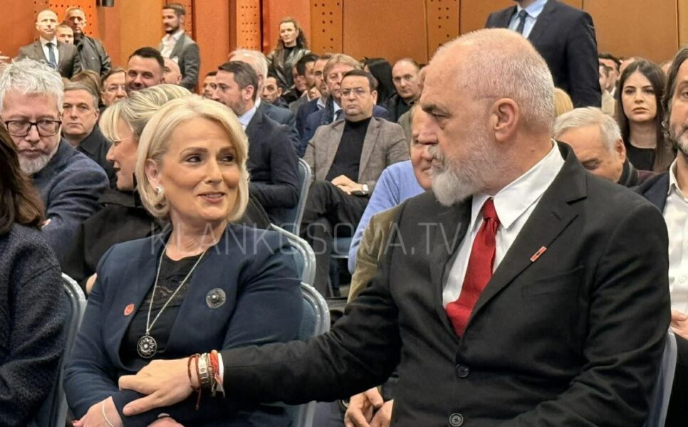Në pamjet e siguruara nga Klan Kosova, vëmendjen e mori kryeministri shqiptar Edi Rama, i cili shihet duke mbajtur për krahu bashkëshorten e ish-presidentit Hashim Thaçi.