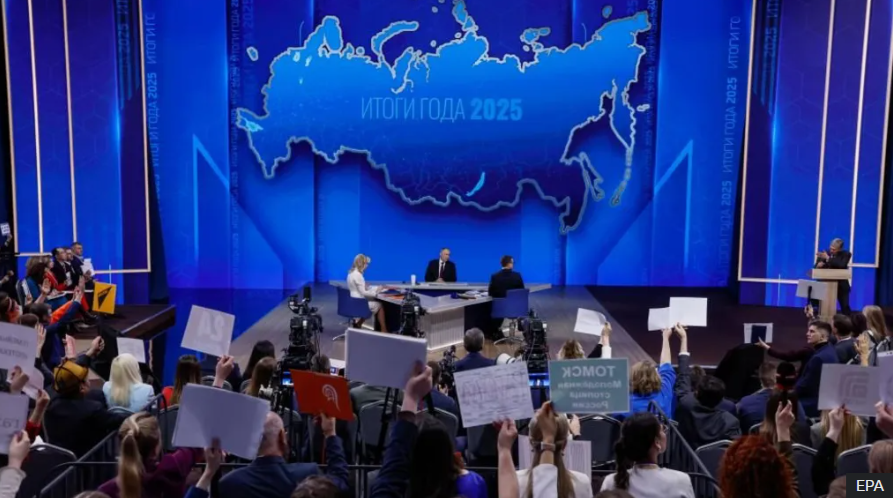 Maratona “Linjë Direkte” kombinoi pyetje nga publiku i gjerë dhe gazetarë nga e gjithë Rusia në një sallë në Moskë, me Putinin të ulur nën një hartë të madhe të Rusisë që përfshinte zonat e pushtuara të Ukrainës, përfshirë Krimenë, të cilën e aneksoi në vitin 2014.