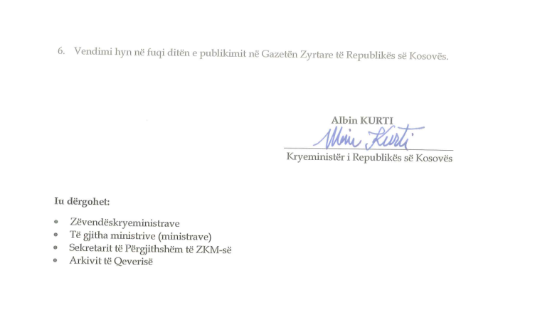 Më tej, në njoftim shtohet se të hollat do të merren nga Ministria e Financave Punës dhe Transfereve, e cila, siç edhe bëhet e ditur obligohet që të zbatojë vendimin.