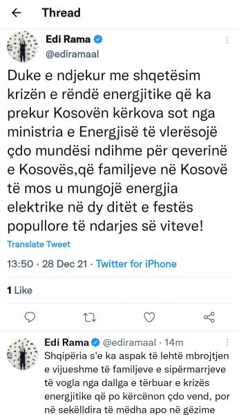 “Duke e ndjekur me shqetësim krizën e rëndë energjitike që ka prekur Kosovën kërkova sot nga ministria e Energjisë të vlerësojë çdo mundësi ndihme për qeverinë e Kosovës,që familjeve në Kosovë të mos u mungojë energjia elektrike në dy ditët e festës popullore të ndarjes së viteve!”, ka shkruar Rama.