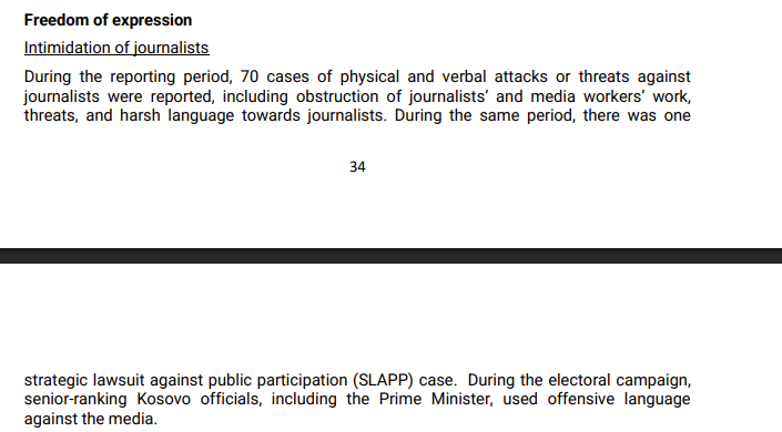 “Gjatë periudhës së raportimit, u raportuan 70 raste të sulmeve fizike dhe verbale ose kërcënimeve ndaj gazetarëve, duke përfshirë pengimin e punës së gazetarëve dhe punonjësve të mediave, kërcënime dhe gjuhë fyese ndaj gazetarëve.