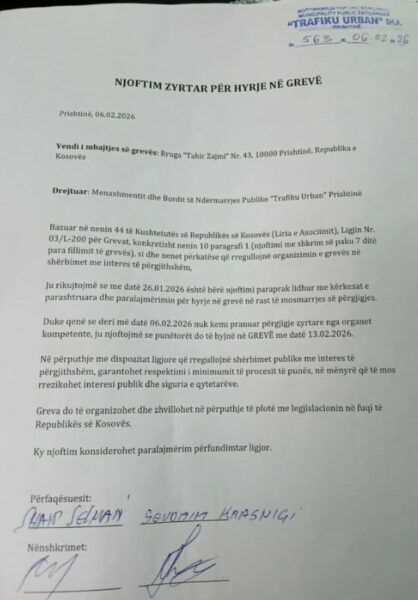 Punëtorët e Ndërmarrjes Publike “Trafiku Urban” në Prishtinë kanë paralajmëruar hyrjen në grevë nga data 13 shkurt 2026, nëse deri atëherë nuk marrin përgjigje institucionale lidhur me kërkesat e tyre.