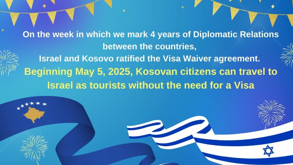 Ambasadorja Ziv theksoi se “që nga 5 maji 2025, qytetarët e Kosovës mund të udhëtojnë në Izrael si turistë pa pasur nevojë për vizë”.
