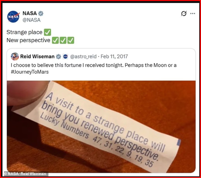 Një tweet i risjellë në dritë tregon komandantin e Artemis II me një copë letre të vogël që përmbante këtë “profeci” në vitin 2017. Në të shkruhej: “Një vizitë në një vend të çuditshëm do të të sjellë një perspektivë të re”, së bashku me disa numra fatlum.
