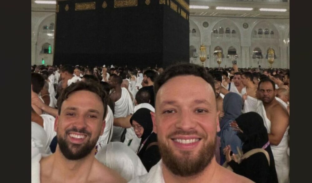 Ai nuk e ka ndërmarrë i vetëm këtë udhëtim kaq të rëndësishëm. Pranë tij, i veshur po ashtu me rrobat e bardha tradicionale të Ihramit, qëndron vëllai i tij, Albi, së bashku me miq të tjerë të ngushtë dhe bashkëpunëtorë.