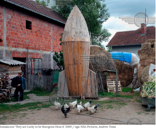 Pak vjetë pas luftës, më 2009, Petriti ju rikthye fshatit me një instalacion arti kontemporan titullum ‘They are Lucky to be Bourgeois Hens II’ (“Janë të lumtuna mu kanë pula borxheze II”), një kotec të pulave në formë rakete fluturuese (pulat janë omniprezente në opusin e hershëm artistik të Halilajt, inspirum prej faqes së famshme të Abetares për shkronjën ‘P’, që e dijnë krejt kosovarët “Pulat e Petritit”).