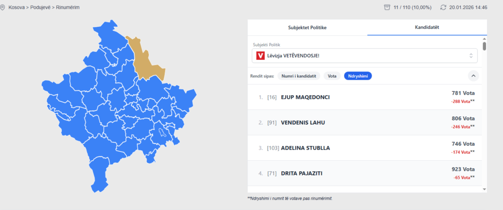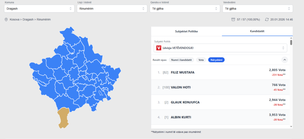Një situatë e ngjashme me kandidatët e VV’së është edhe në Dragash. Për dallim nga partitë e tjera, atje ku tashmë ka përfunduar rinumërimi i plotë, një kandidati të VV’së, u janë hequr qindra vota. Më saktësisht,  Filiz Mustafa tash ka 231 vota më pak. /GazetaExpress