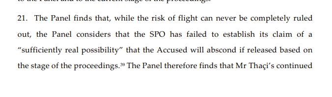 Megjithatë në këtë vendim, Paneli i gjyqtarëve ka konstatuar se argumenti i parë i Prokurorisë në kërkesën për vazhdim të paraburgimit nuk është i mbështetur plotësisht. Bëhet fjalë për “rrezikun e ikjes”. Gjykata konstaton se ndonëse s’mund të përjashtohet plotësisht, Prokuroria s’ka arritur të dëshmojë mjaftueshëm që ekziston një mundësi reale dhe e besueshme që Hashim Thaçi do të arratiset në rast se lirohet.