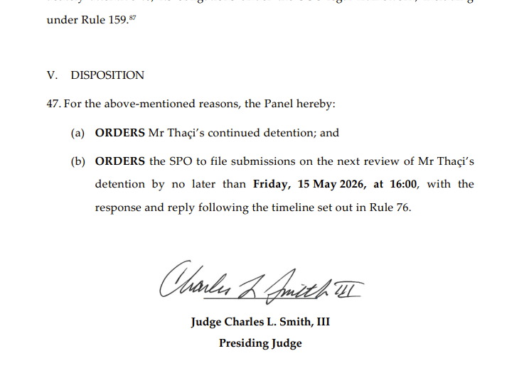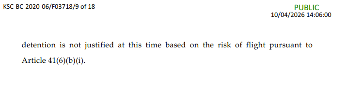 “Paneli konstaton se, ndërsa rreziku i arratisjes nuk mund të përjashtohet kurrë plotësisht, Paneli konsideron se Prokuroria Speciale nuk ka arritur të vërtetojë pretendimin e saj për një “mundësi mjaftueshëm reale” që i Akuzuari të arratiset nëse lirohet bazuar në fazën e procedurave”, thuhet në dokumentin e Gjykatës Speciale të publikuar me datën 13 prill 2026, raporton Gazeta Express.