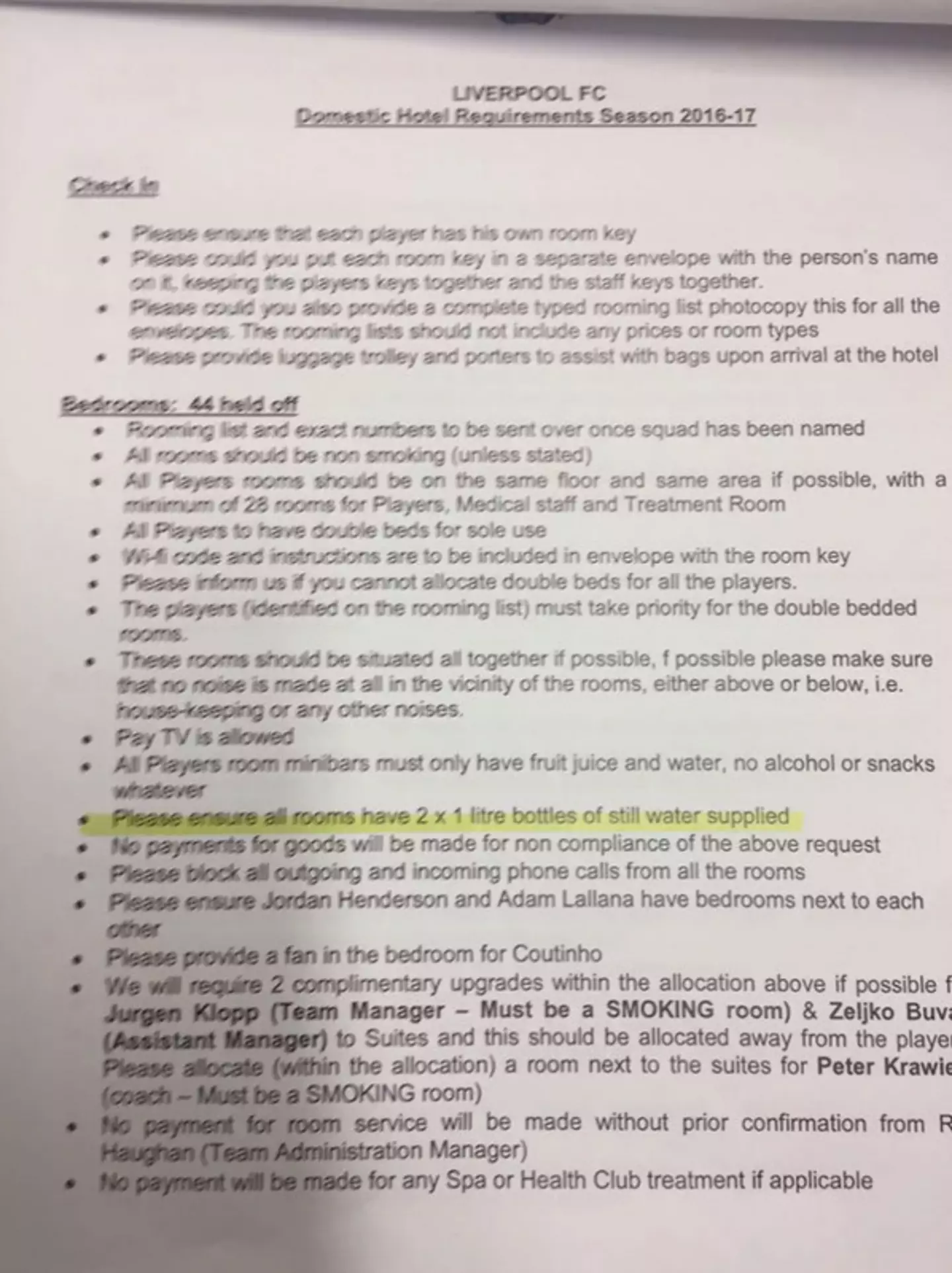 Para ndeshjes miqësore në Stadiumin John Smith, një dokument që zbulojë kërkesat e hotelit për futbollistët e Liverpoolit u publikua përmes The Daily Star.