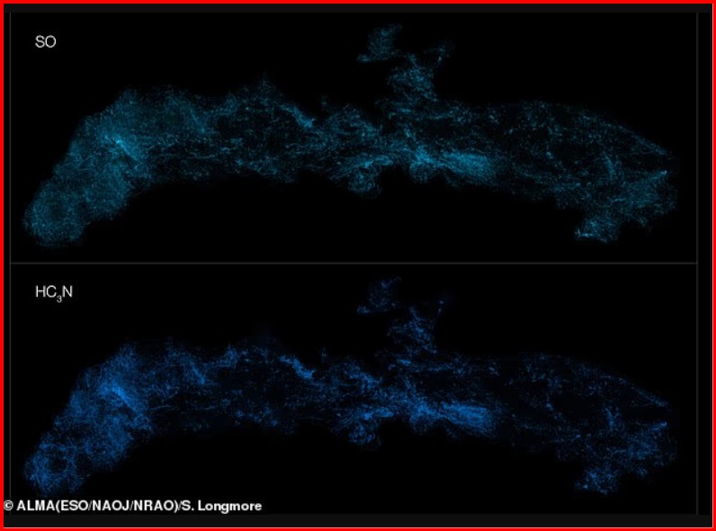 Edhe pse zona është e mbuluar nga pluhuri, teleskopi ALMA mund të imazhojë gazin e ftohtë të CMZ-së – materiali themelor nga i cili lindin yjet.