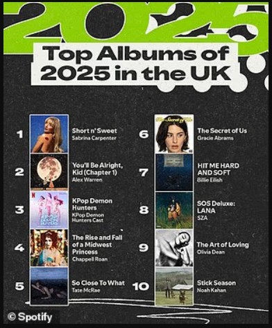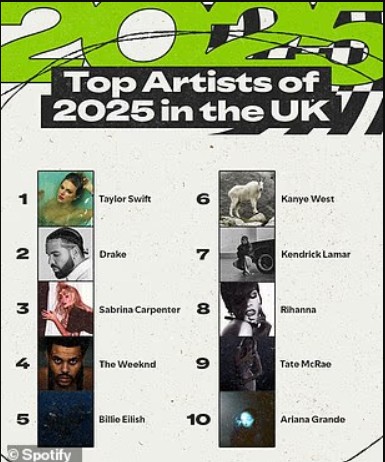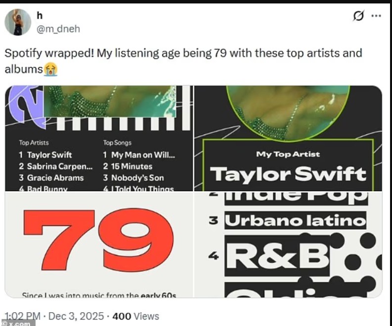 Artist më i dëgjuar: Taylor Swift (për herën e tretë radhazi), e ndjekur nga Drake, Sabrina Carpenter, The Weeknd dhe Billie Eilish. Spotify Wrapped 2025 vazhdon të jetë një mbledhje e detajuar dhe argëtuese e muzikës që dëgjuat gjatë vitit, duke i dhënë përdoruesve mundësinë të zbulojnë sa “i ri ose i vjetër në shpirt” janë sipas shijes së tyre muzikore. /GazetaExpress/