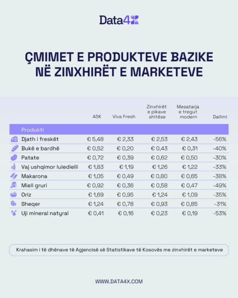 Një analizë e re nga Data4X ka vënë në pah dallimet e mëdha mes çmimeve në tregun tradicional (marketet e lagjes) dhe atë modern (supermarketet) në Kosovë. Të dhënat e analizuara për vitin 2024 tregojnë se tregu tradicional mbetet më i shtrenjtë, ndërsa zinxhirët modernë të marketeve, të cilët përfaqësojnë rreth 75% të vlerës së tregut, ofrojnë çmime mesatarisht më të ulëta për produktet bazike.
