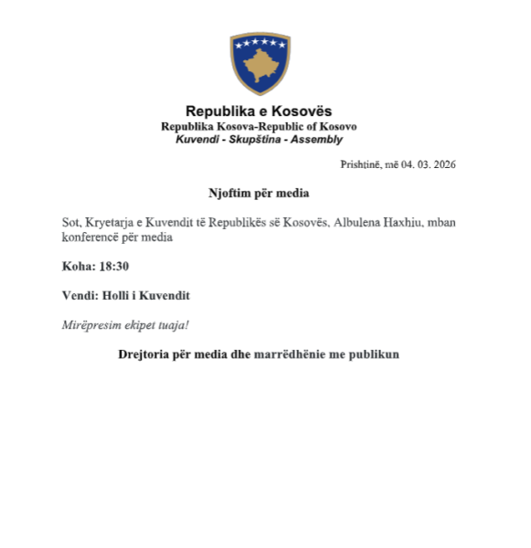 Kryetarja e Kuvendit, Albulena Haxhiu, do të mbajë konferencë për media duke filluar nga ora 18:30.