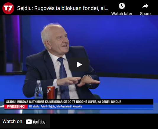 “Unë them se shumëçka është keqinterpretuar, unë e di se Rugova, pavarësisht se e ka pasë moton apo ecjen e tij në paqe, gjithmonë e ka menduar se do të ndodh lufta. Ka qenë i bindur se ka me ndodh, ka qenë i bindur nga fillimi, nga ’91, kur kanë shkuar njerëzit që të përgaditen në Shqipëri. Kanë qenë disa qendra stërvitore atje, ku kanë shkuar edhe Adem Jashari e Zahir Pajaziti”, ka thënë Sejdiu në Pressing.