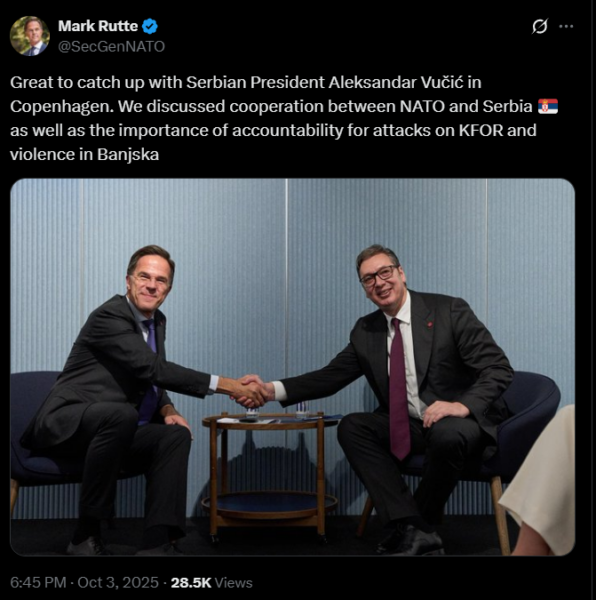 Sekretari i Përgjithshëm i NATO-s, Mark Rutte, ka njoftuar se ka zhvilluar një takim me presidentin e Serbisë, Aleksandar Vuçiq, në Kopenhagë.