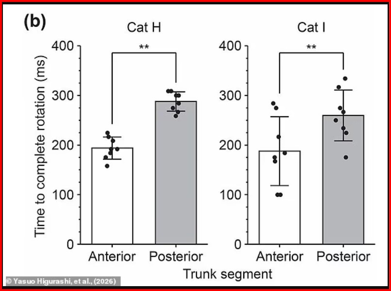 Për të provuar këtë, Dr Higurashi dhe bashkëpunëtorët analizuan shtyllat kurrizore të maceve të dhuruara universiteteve dhe pamjet video të maceve të rëna nga një lartësi prej 1 metri. Ata vunë re se macet rrotullojnë pjesën e përparme pak më shpejt se pjesën e pasme.