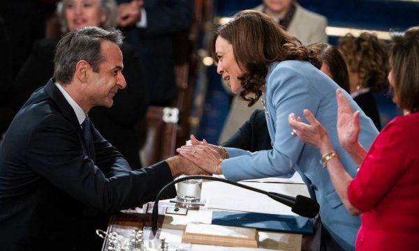 Qysh në hapat e parë të tij në sallë, Mitostakis përcillet me duartrokitje nga anëtarët e Dhomës së Përfaqësuesve, të cilët me buzëqeshje e shtrëngime duarsh e përcillnin ngrohtësisht kryeministrin grek drejt foltores së Dhomës së Përfaqësuesve, ku e prisnin edhe zv.presidentja Kamala Harris dhe drejtuesja e Dhomës së Përfaqësuesve, Nancy Pelosi.
