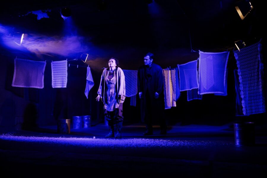 Tri personazhet (nga katër) e shfaqjes (gra) do të përballen me veten dhe mes vete në një gjuhë të tensionuar, të mbytur, shumë dëshpëruese për të qenë e zakonshme. E përtej krejt kësaj, ajo që i lidh personazhet, thënë më mirë, që tenton t’i lidhë në një raport që për vite nuk ka qenë i lidhur siç duhet, është skena (dhoma) në të cilën luhet shfaqja. Vendosja e tenteneve të varura për t’u tharë ndërron forma deri në fund, mënyra së si ato vendosen në tel, ndryshon me ndryshimin e ngjarjeve, deri në fund kur hapet e gjithë dhoma dhe shihet qartazi në të.