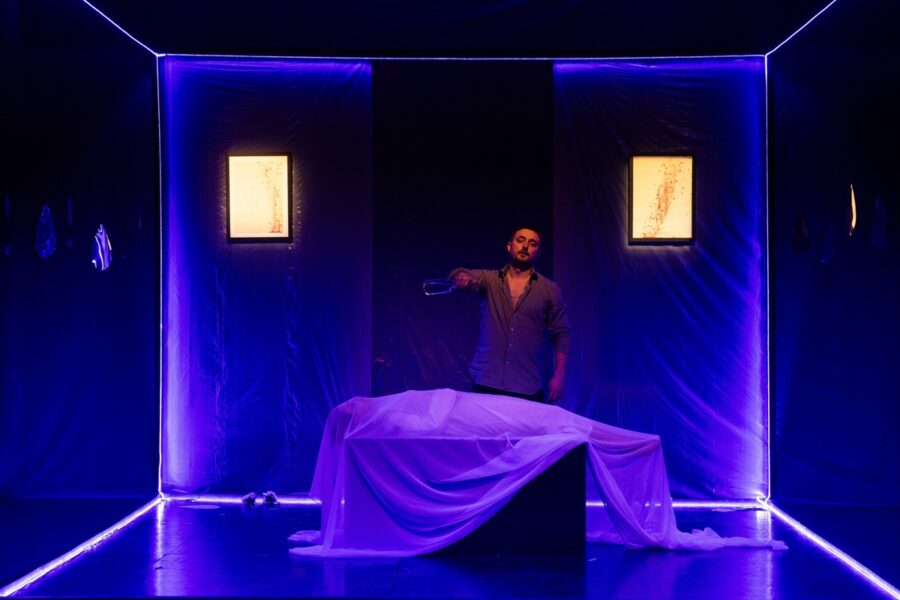 Në shfaqjen që vjen në një skenë të pangarkuar, me tre aktorë, ideja dhe koncepti i saj janë arma kryesore. Tragjedia që nis me ritëm, me çiltërsi, shpërqendrim, cigare dhe alkool mbaron me qirinj mbi arkivol.
